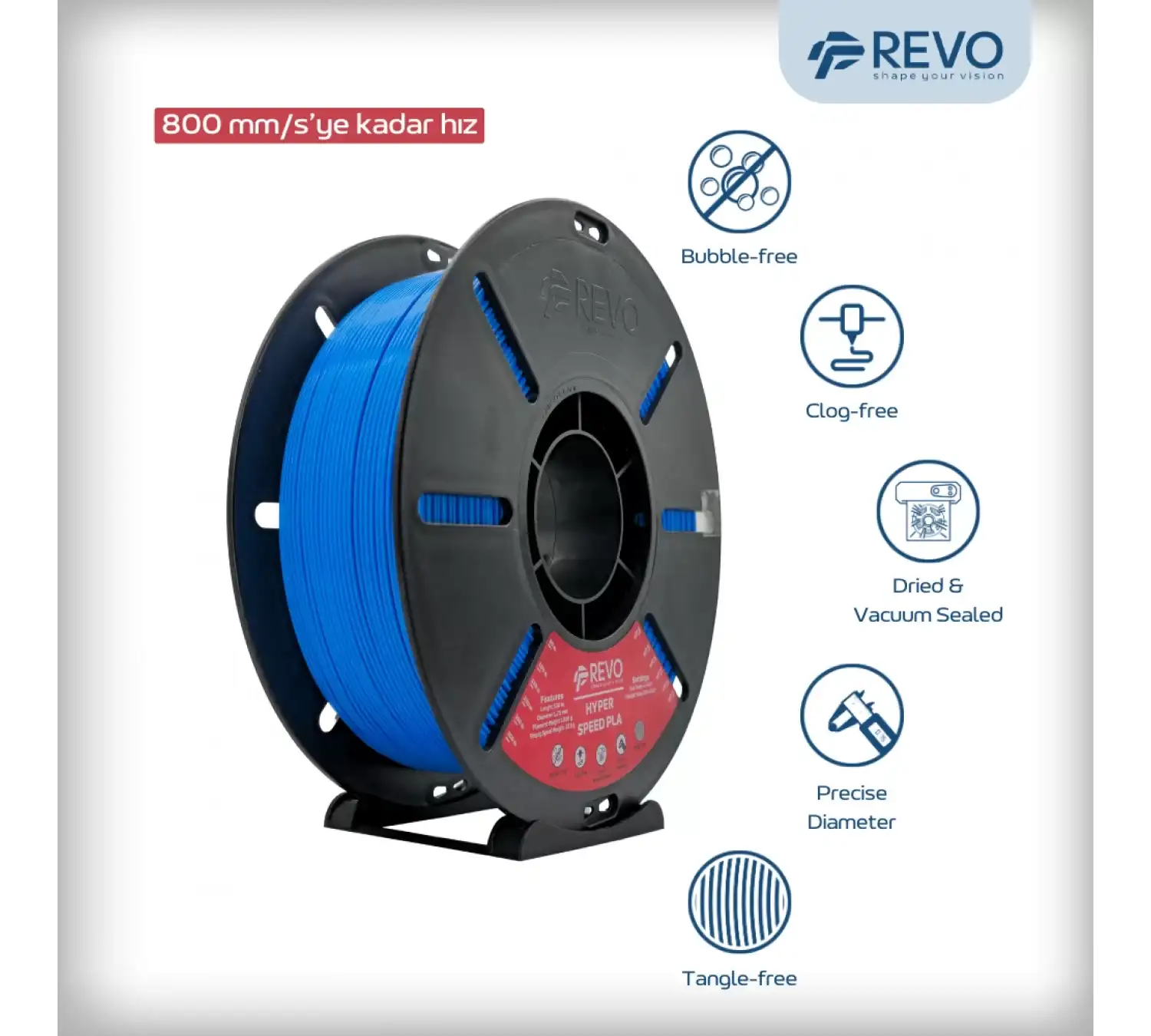 Bu filament, Revo mühendisliğinin bir sonucudur. Kaliteyi şansa bırakmayan, her ayrıntıyı test eden bir ekibin elinden çıkmıştır.