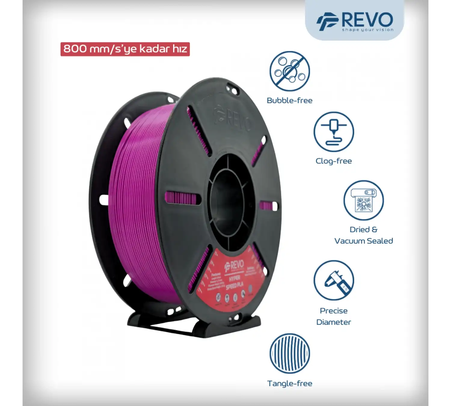 Bu filament, Revo mühendisliğinin bir sonucudur. Kaliteyi şansa bırakmayan, her ayrıntıyı test eden bir ekibin elinden çıkmıştır.