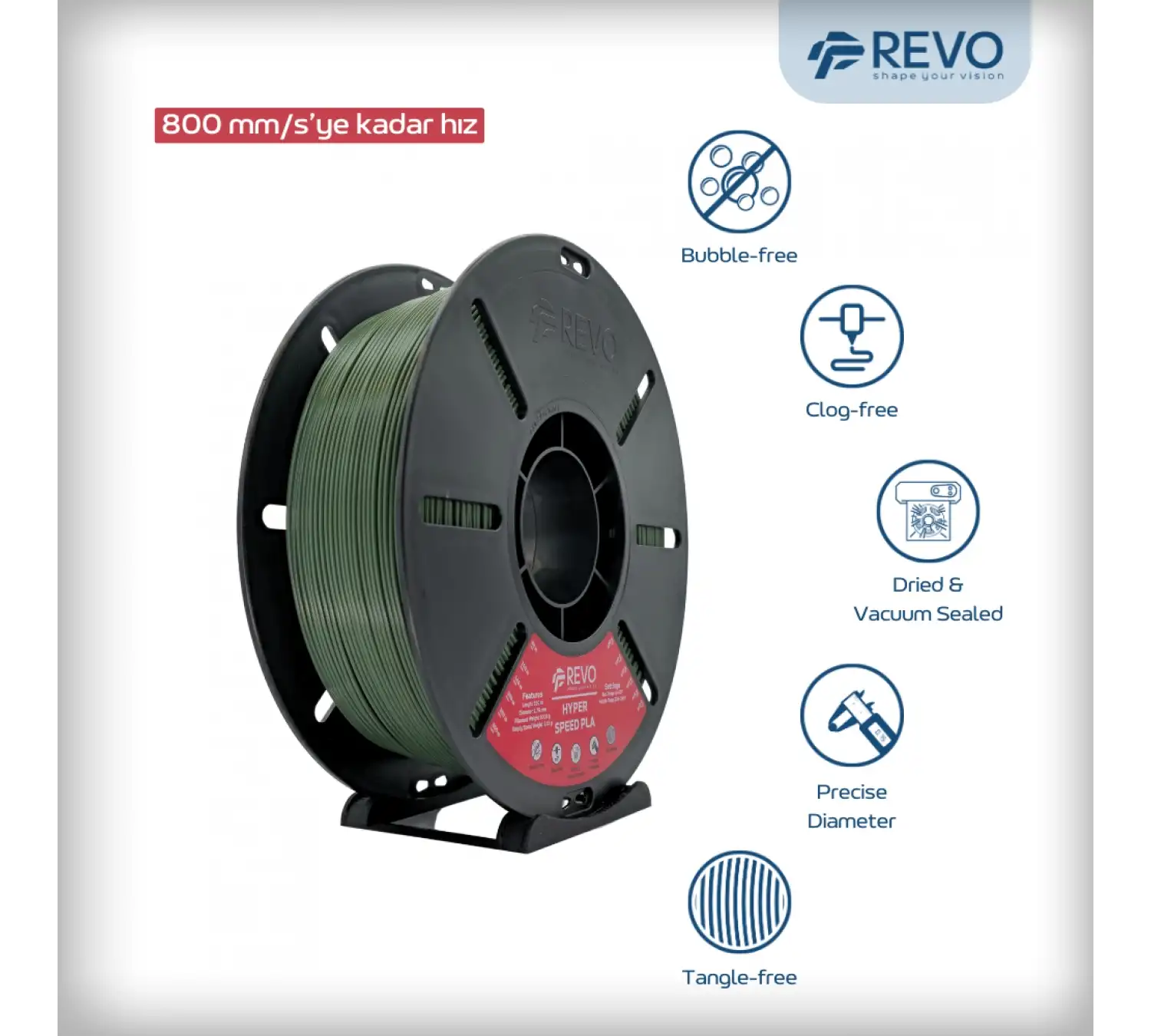 Bu filament, Revo mühendisliğinin bir sonucudur. Kaliteyi şansa bırakmayan, her ayrıntıyı test eden bir ekibin elinden çıkmıştır.