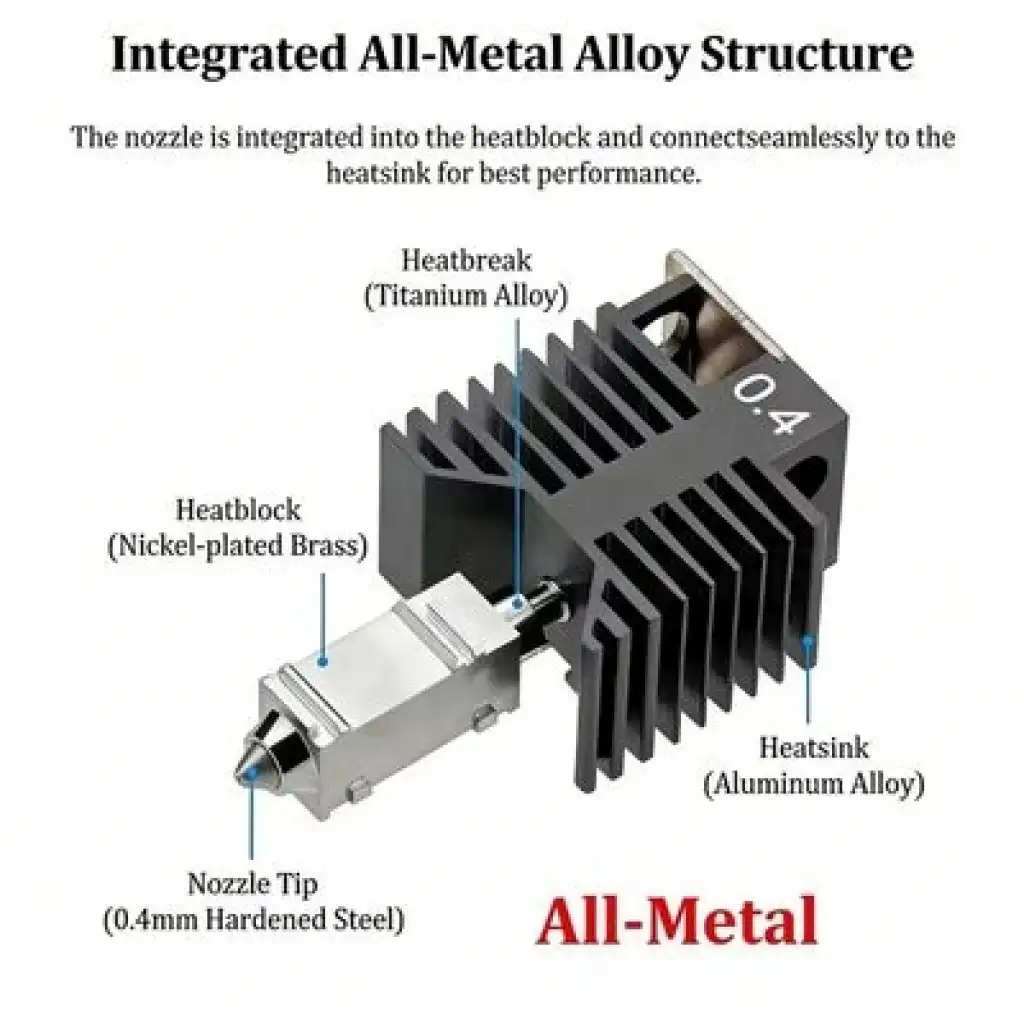0.4 mm nozzle çapı, hem detaylı hem de dengeli hızda baskılar için ideal olup PLA, PETG, TPU gibi yaygın filamentlerle uyumlu çalışır. Dahili seramik ısıtıcı, nozzle’ın 300°C’ye kadar stabil şekilde ısınmasını sağlayarak geniş malzeme desteği sunar.